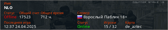 Последний раз был в сети 12:37 24.04.2025 Игрок с таким ником замечен на 14 серверах