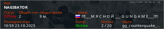 Играет на Counter Strike 1.6 сервере. Страна: РоссияПервый раз замечен 16:28 28.03.2024