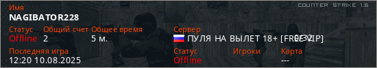 Играет на Counter Strike 1.6 сервере. Страна: РоссияПервый раз замечен 11:41 10.08.2025