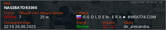 Играет на Counter Strike 1.6 сервере. Страна: РоссияПервый раз замечен 21:08 17.06.2025