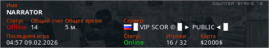 Играет на Counter Strike 1.6 сервере. Страна: РоссияПервый раз замечен 04:52 09.02.2026