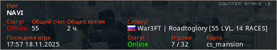 Играет на Counter Strike 1.6 сервере. Страна: РоссияПервый раз замечен 09:43 13.04.2021
