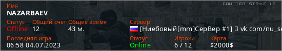 Играет на Counter Strike 1.6 сервере. Страна: РоссияПервый раз замечен 11:23 02.07.2023