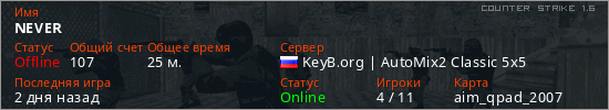 Играет на Counter Strike 1.6 сервере. Страна: РоссияПервый раз замечен 17:20 17.02.2026