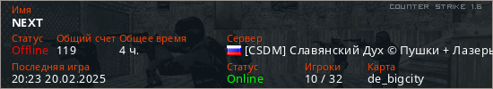 Последний раз был в сети 20:23 20.02.2025 Игрок с таким ником замечен на 24 серверах
