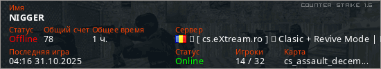 Играет на Counter Strike 1.6 сервере. Страна: РумынияПервый раз замечен 13:04 09.11.2024