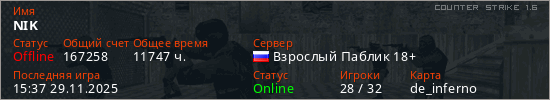 Последний раз был в сети 15:37 29.11.2025 Игрок с таким ником замечен на 31 сервере