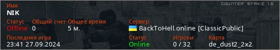 Играет на Counter Strike 1.6 сервере. Страна: УкраинаПервый раз замечен 23:39 27.09.2024