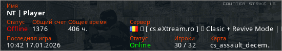Играет на Counter Strike 1.6 сервере. Страна: РумынияПервый раз замечен 14:48 28.10.2024