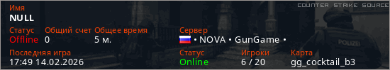 Играет на Counter Strike Source сервере. Страна: РоссияПервый раз замечен 17:47 14.02.2026