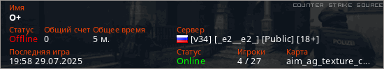Играет на Counter Strike Source сервере. Страна: РоссияПервый раз замечен 19:50 29.07.2025