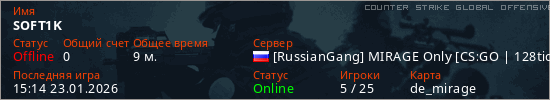 Играет на Counter Strike Global Offensive сервере. Страна: РоссияПервый раз замечен 14:43 23.01.2026