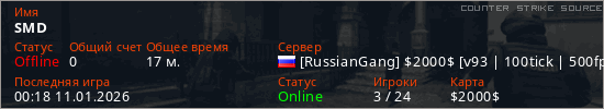 Играет на Counter Strike Source сервере. Страна: РоссияПервый раз замечен 01:03 05.01.2026