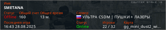 Последний раз был в сети 16:43 28.08.2025 Игрок с таким ником замечен на 16 серверах