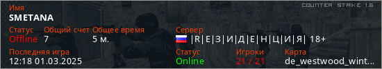 Играет на Counter Strike 1.6 сервере. Страна: РоссияПервый раз замечен 11:35 01.03.2025