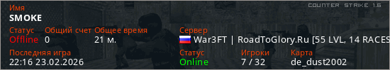 Играет на Counter Strike 1.6 сервере. Страна: РоссияПервый раз замечен 17:37 08.02.2026