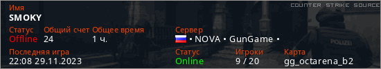 Играет на Counter Strike Source сервере. Страна: РоссияПервый раз замечен 10:55 20.05.2023