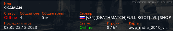 Играет на Counter Strike Source сервере. Страна: РоссияПервый раз замечен 08:30 22.12.2023