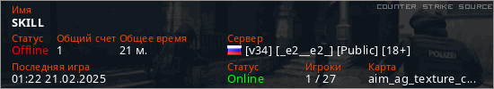 Играет на Counter Strike Source сервере. Страна: РоссияПервый раз замечен 15:46 11.10.2023