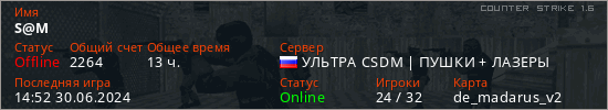 Играет на Counter Strike 1.6 сервере. Страна: РоссияПервый раз замечен 10:39 11.02.2024