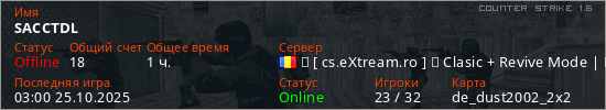 Играет на Counter Strike 1.6 сервере. Страна: РумынияПервый раз замечен 20:51 04.01.2025