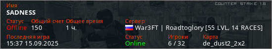 Играет на Counter Strike 1.6 сервере. Страна: РоссияПервый раз замечен 22:55 06.09.2025