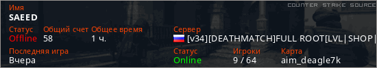 Играет на Counter Strike Source сервере. Страна: РоссияПервый раз замечен 15:30 19.11.2025