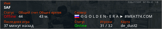Играет на Counter Strike 1.6 сервере. Страна: РоссияПервый раз замечен 07:18 07.04.2026