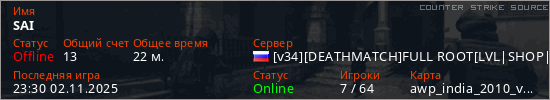 Играет на Counter Strike Source сервере. Страна: РоссияПервый раз замечен 22:06 29.10.2025