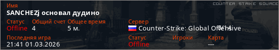 Играет на Counter Strike Source сервере. Страна: РоссияПервый раз замечен 21:24 01.03.2026