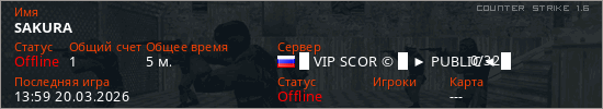 Играет на Counter Strike 1.6 сервере. Страна: РоссияПервый раз замечен 13:57 20.03.2026