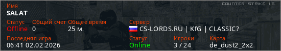 Играет на Counter Strike 1.6 сервере. Страна: РоссияПервый раз замечен 19:26 25.12.2024