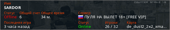 Играет на Counter Strike 1.6 сервере. Страна: РоссияПервый раз замечен 19:56 05.07.2025