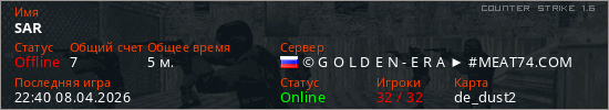 Играет на Counter Strike 1.6 сервере. Страна: РоссияПервый раз замечен 22:23 08.04.2026
