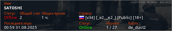 Играет на Counter Strike Source сервере. Страна: РоссияПервый раз замечен 00:59 23.02.2025