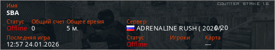 Играет на Counter Strike 1.6 сервере. Страна: РоссияПервый раз замечен 12:44 24.01.2026