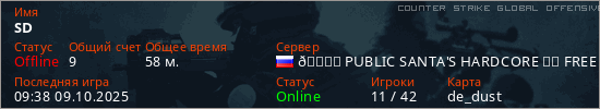 Играет на Counter Strike Global Offensive сервере. Страна: РоссияПервый раз замечен 10:55 20.08.2025