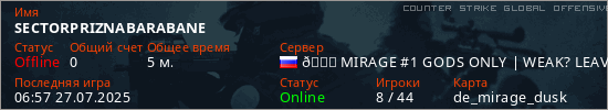 Играет на Counter Strike Global Offensive сервере. Страна: РоссияПервый раз замечен 06:53 27.07.2025