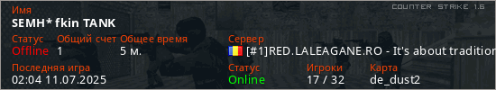 Играет на Counter Strike 1.6 сервере. Страна: РумынияПервый раз замечен 01:49 11.07.2025