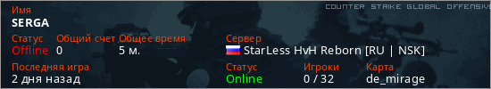 Играет на Counter Strike Global Offensive сервере. Страна: РоссияПервый раз замечен 22:42 16.02.2026