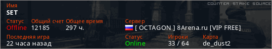 Играет на Counter Strike Source сервере. Страна: РоссияПервый раз замечен 23:40 09.09.2021