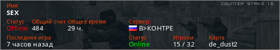 Играет на Counter Strike 1.6 сервере. Страна: РоссияПервый раз замечен 02:34 02.05.2022