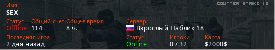 Играет на Counter Strike 1.6 сервере. Страна: РоссияПервый раз замечен 11:22 08.11.2019
