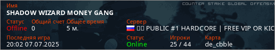 Играет на Counter Strike Global Offensive сервере. Страна: РоссияПервый раз замечен 19:51 07.07.2025
