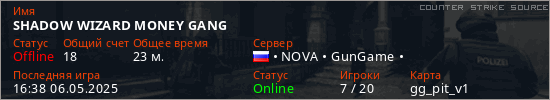 Играет на Counter Strike Source сервере. Страна: РоссияПервый раз замечен 09:27 22.01.2025