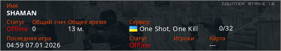 Играет на Counter Strike 1.6 сервере. Страна: УкраинаПервый раз замечен 01:57 06.01.2026