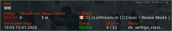 Играет на Counter Strike 1.6 сервере. Страна: РумынияПервый раз замечен 12:58 15.01.2026