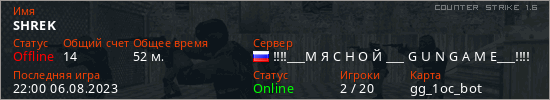 Играет на Counter Strike 1.6 сервере. Страна: РоссияПервый раз замечен 18:15 19.07.2023