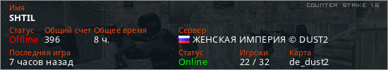 Играет на Counter Strike 1.6 сервере. Страна: РоссияПервый раз замечен 17:25 20.08.2025