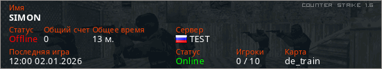 Играет на Counter Strike 1.6 сервере. Страна: РоссияПервый раз замечен 22:45 01.01.2026